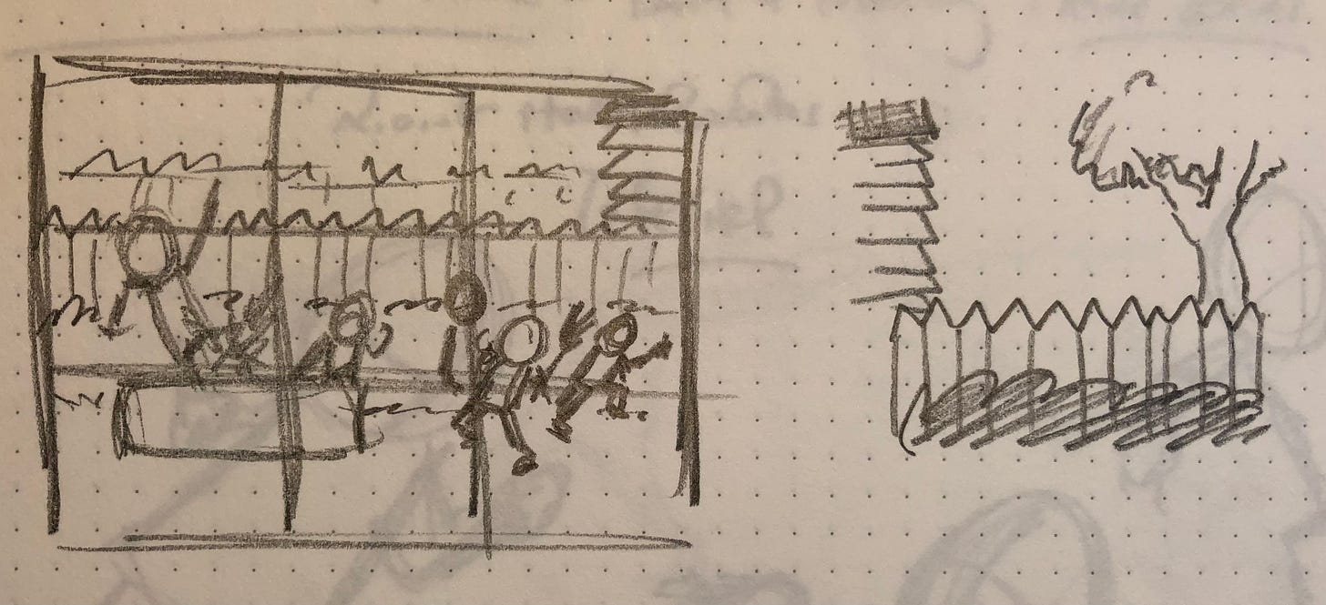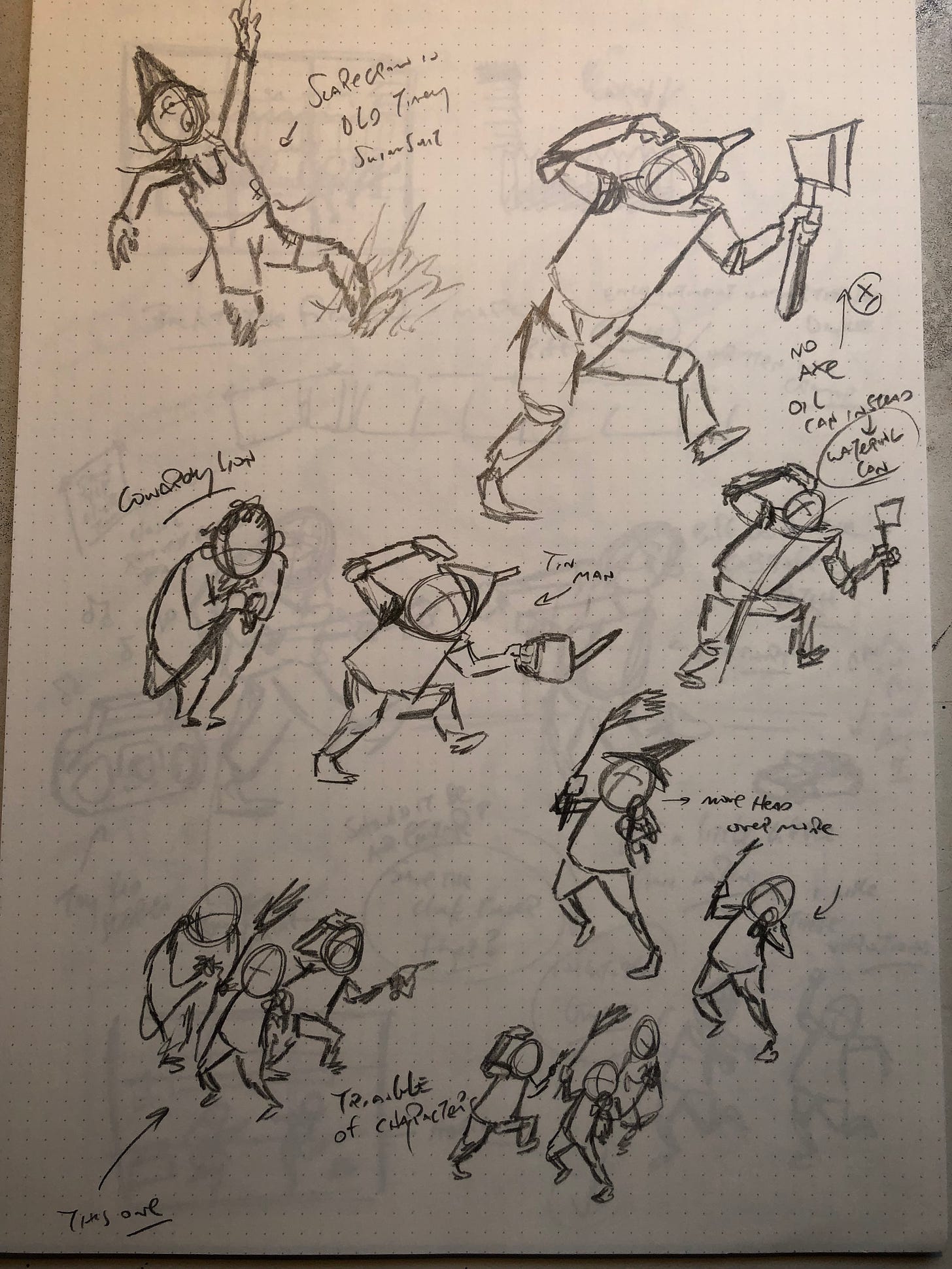 I say thumbnails but it’s really concept art. This is how the art sausage is made in a sketchbook. This is how a sketchbook should be. Failures upon failures. I like to think of the poses as thumbnails too. Sometimes it’s barely an 1/8th of a page to figure it out and other times, it’s two pages trying to figure out a body pose or a hand gesture. The importance is figuring it out and bringing your idea to life.