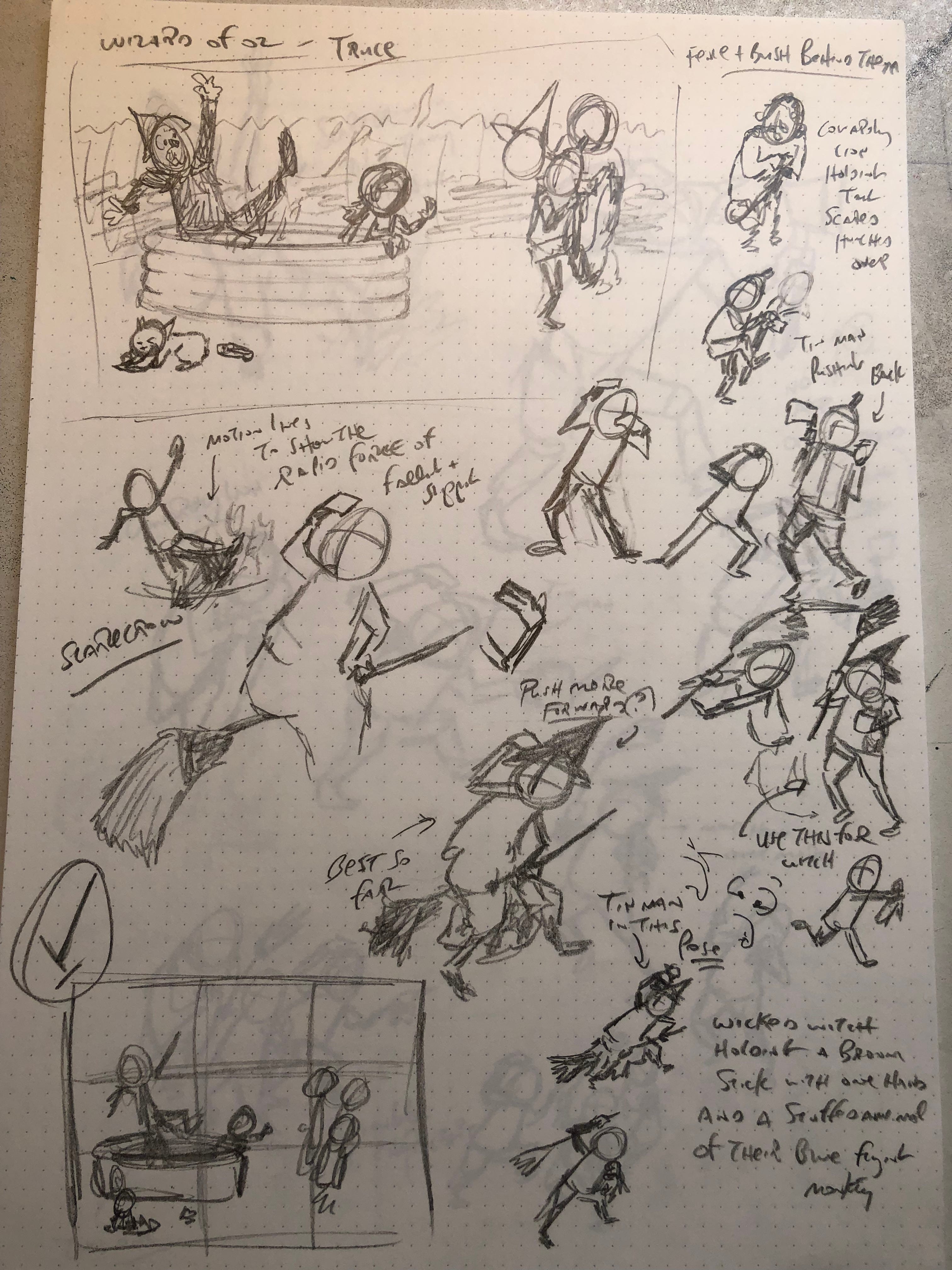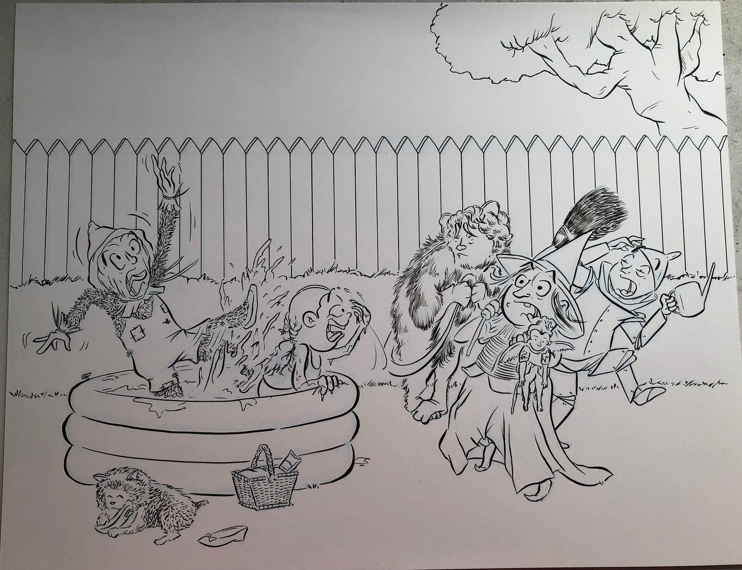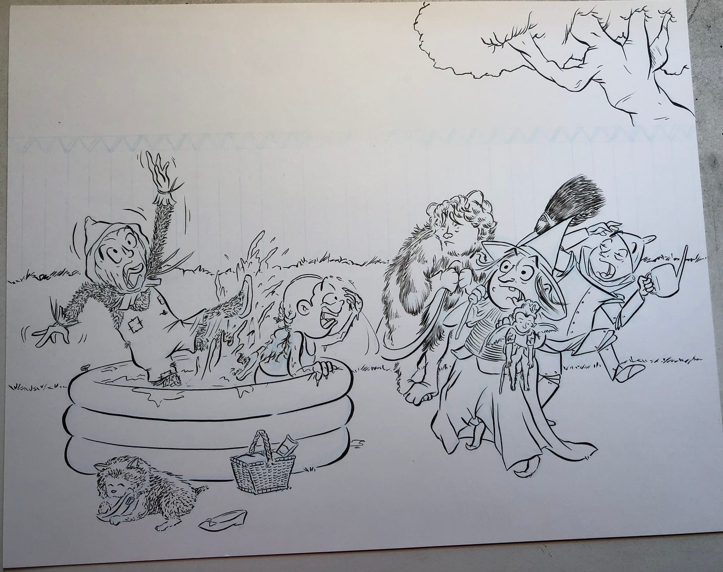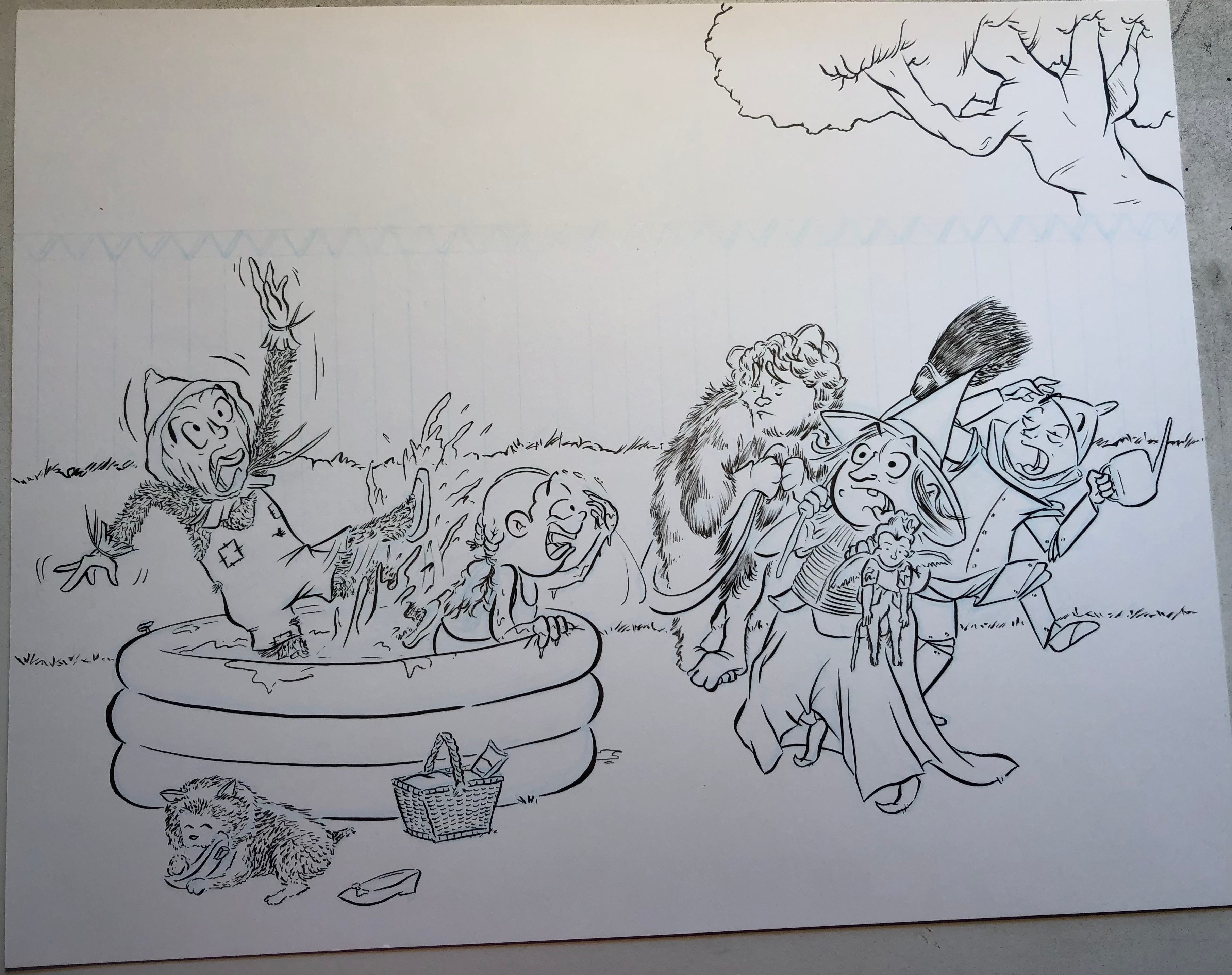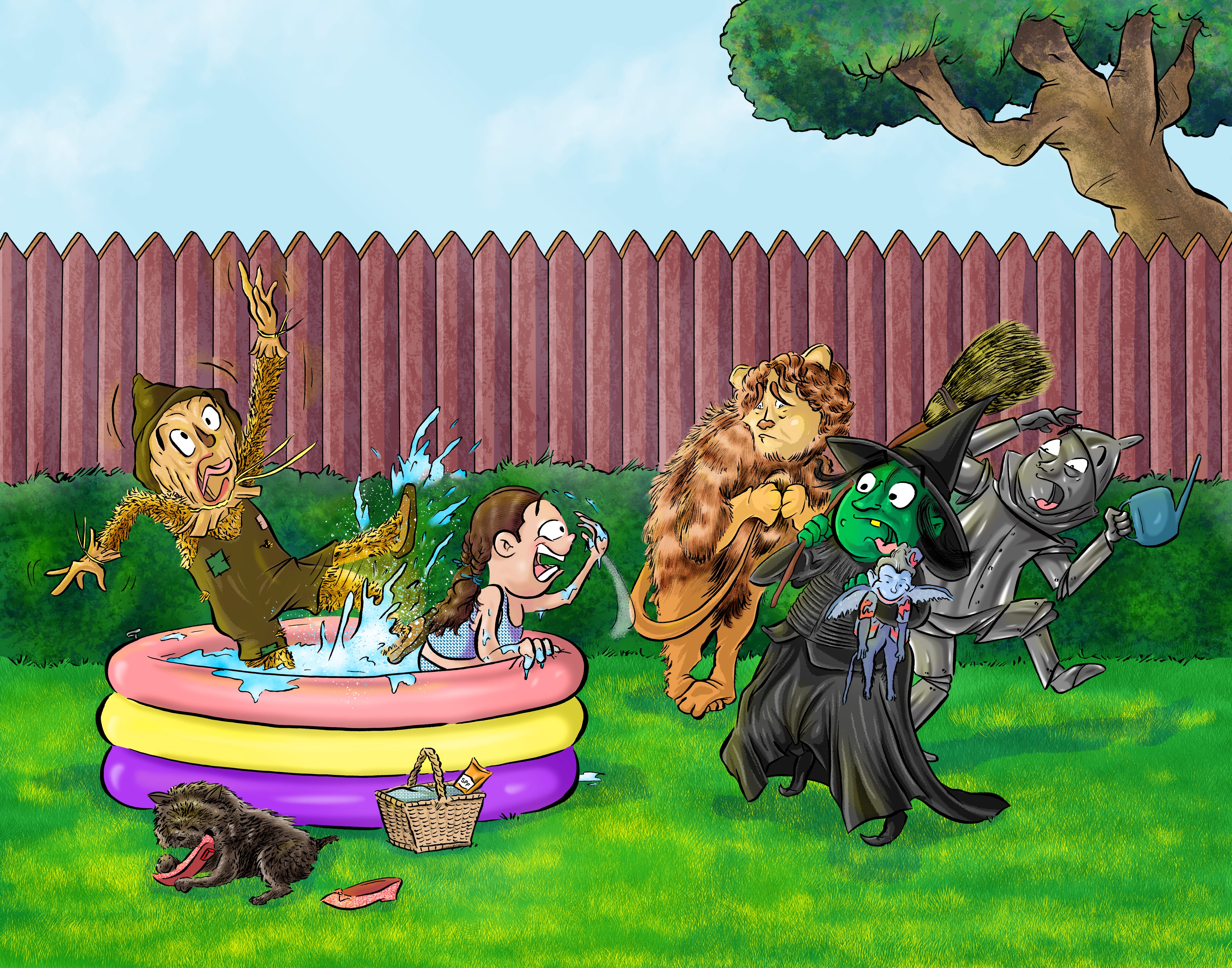 I thought putting them in a fun pool time scene would work to introduce as much of their personalities as possible. The Wicked Witch is scared of melting, Tin Man is scared of rusting, Cowardly Lion is just scared and the Scarecrow is slipping in the water! It’s fun to have Toto chewing the slippers and Dorothy cluelessly trying to bring everyone together.