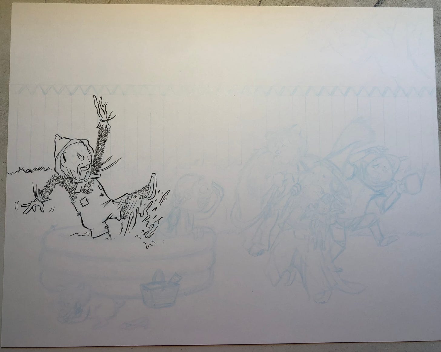 This piece is inked with a brush and india ink traditionally on 14x11 bristol board over non-photo blue pencil. The fence is inked with an 01 micron with my grid ruler. Being an artist means you are excited about things like grid rulers or pencil extenders. Hmm…I really do love my pencil extender.