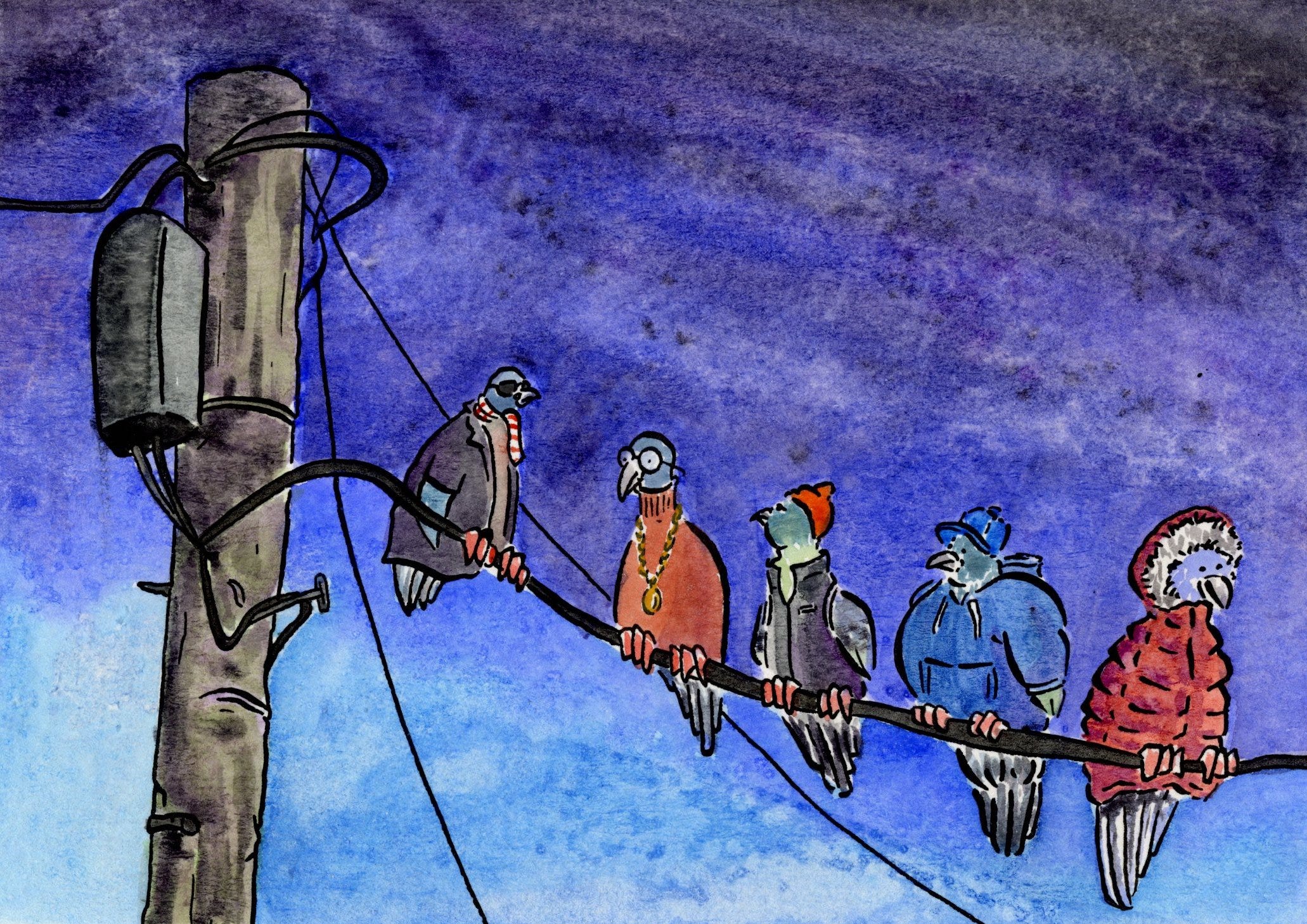 My second postcard depicts the many fits of New Yorkers in the winter months but on everyone’s favorite NYers, the pigeons.