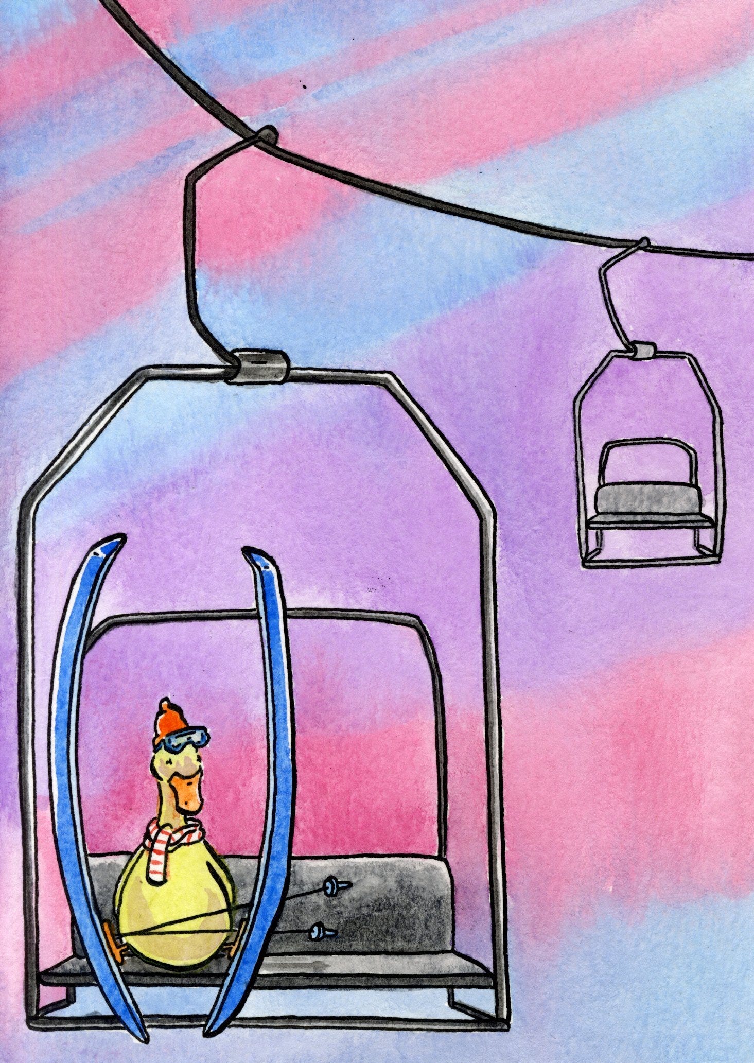 As I brainstormed different ideas, I couldn’t stop thinking how a little duck sitting on a ski lift with giant skies on was funny to me. Shouldn’t they be in the south for the winter? How did they get these skis on without thumbs? Why did they think a hat and scarf was enough to go skiing? The duck do I know!